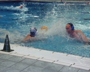 | Anschwimmen zum 2. Viertel – Jürgen kommt nicht ganz so schnell an den Ball wie sein Gegner |
