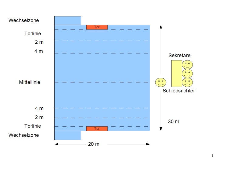 Spielfeld: Die Spielfeldmaße sind abhängig von der zur Verfügung stehenden Wasserfläche und betragen für: