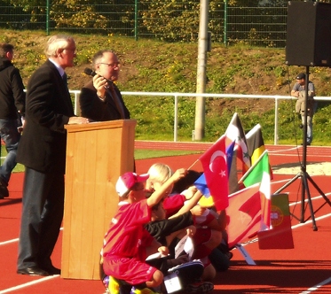 Der Höhepunkt am 15. Oktober auf der neuen Sportanlage am Vossacker war sicherlich für alle Anwesenden die Begrüßung der Gäste durch junge Menschen der neun verschiedenen Nationen, die z. Zt. in Vorhalle leben, in ihrer Landessprache. Das war ein wunderbares „Glück Auf“ für den Sport in Vorhalle.