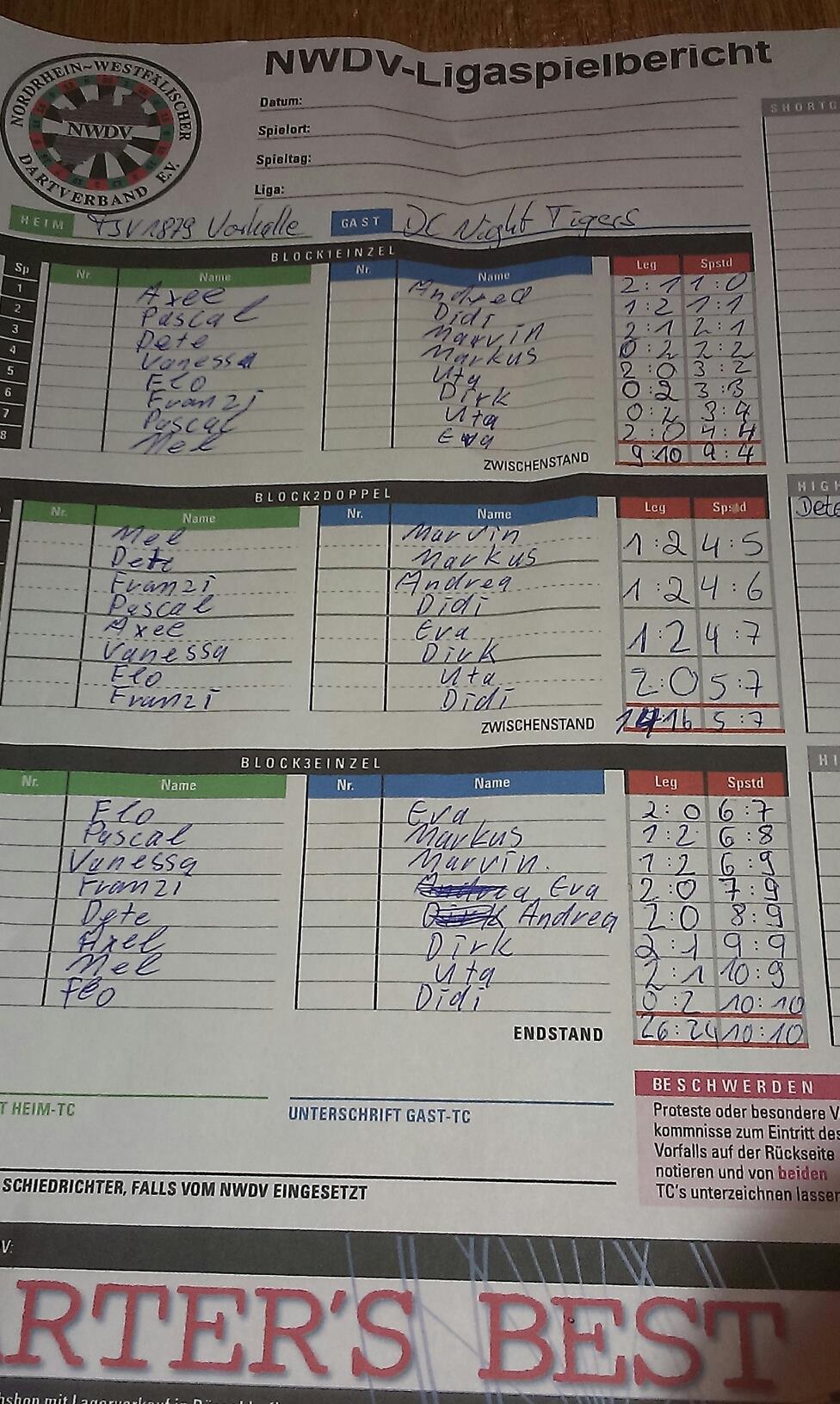 In den Doppeln zeigte sich die Unerfahrenheit unseres Teams, schließlich haben 3 Starter, eine Dartserfahrung von nur ca. drei Monaten. Wir gaben, diesen Block mit 1-3 an die Tigers. Nur Franzy und Flo konnten gegen ihre Gegner punkten. Nach diesem Block lagen wir mit 5-7 zurück.