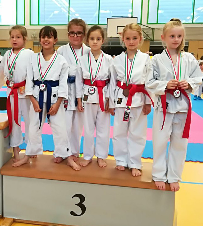 Auch das Kata Team mit Larissa, Marina und Lea sicherte sich mit Platz 3 einen Podestplatz und brachte Bronze mit nach Hause.