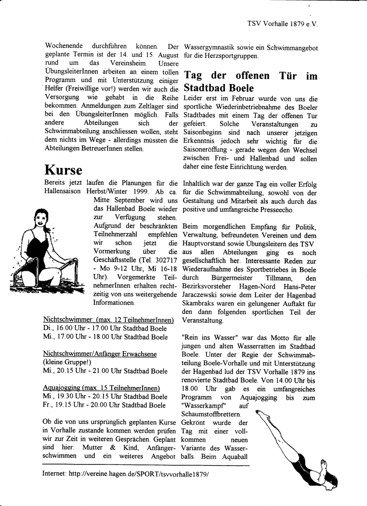 Ende der 1990 Jahre löste sich der Schwimmverein in Boele auf und die SchwimmerInnen wechselten zum TSV VORHALLE 1879. In den besten Zeiten dieser Abteilung stellten die Schwimmer über 600 Mitglieder innerhalb des TSV.