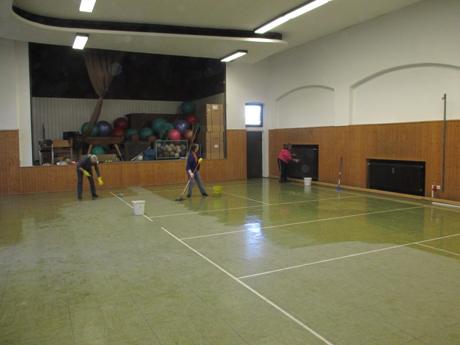 Grundreinigung Hallenboden durch TSV Frauen – im Hintergrund Bühne mit Sportmaterial aus der Nöhstrasse